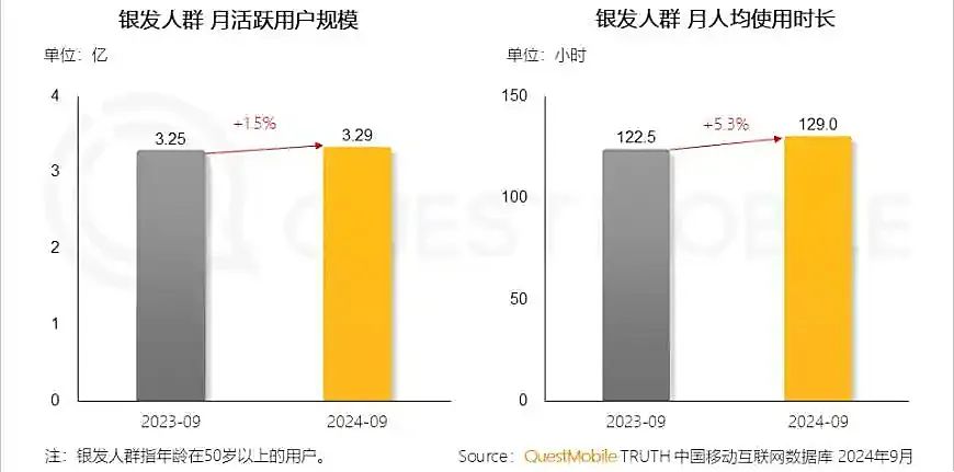 据QuestMobile数据,至2024年9月,老年群体月人均使用网络时长,已达129小时。