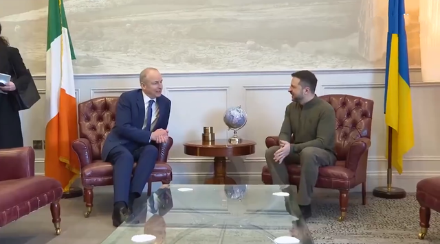 在2月27日当天,泽连斯基坐飞机飞往华盛顿要和川普签订协议,值得一提的是在昨天泽连斯基飞往华盛顿期间还在爱尔兰香农机场停留,与爱尔兰总理马丁会面。随后直接飞往华盛顿与特朗普会谈。当天泽连斯基穿军绿色的卫衣和工装裤下飞机和爱尔兰总理热情握手问候,两人虽然短暂的接触,不过看起来泽连斯基还是很开心。